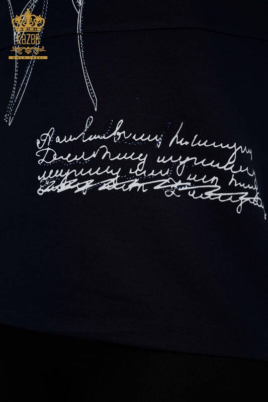Großhandel Damenbluse Blumenmuster Stein bestickt Marineblau - 79059 | KAZEE