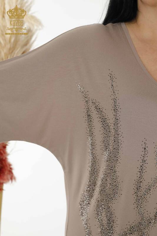 Großhandel Damenbluse gemustert Kurzarm Stein bestickt Nerz - 79070 | KAZEE