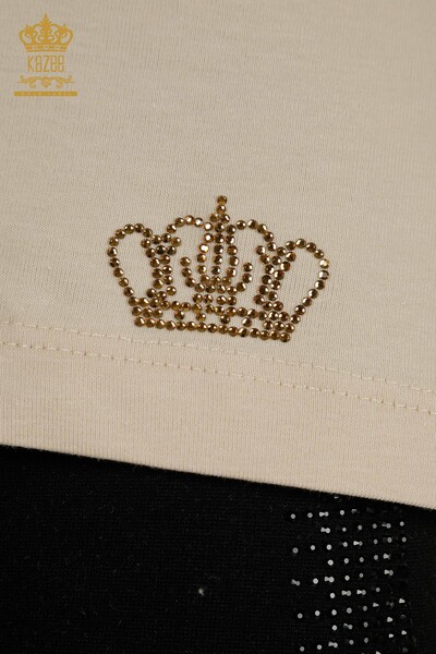 Großhandel Damenbluse mit kurzen Ärmeln und Steinstickerei, V-Ausschnitt, Hellbeige – 79561 | KAZEE