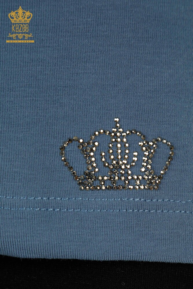 Damenbluse mit kurzen Ärmeln und Steinstickerei, V-Ausschnitt, Indigo – 79561 | KAZEE