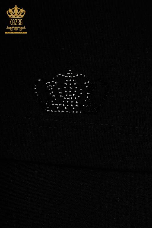 Großhandel Damenbluse Kurzarm Steinbestickt V-Ausschnitt Schwarz - 79561 | KAZEE