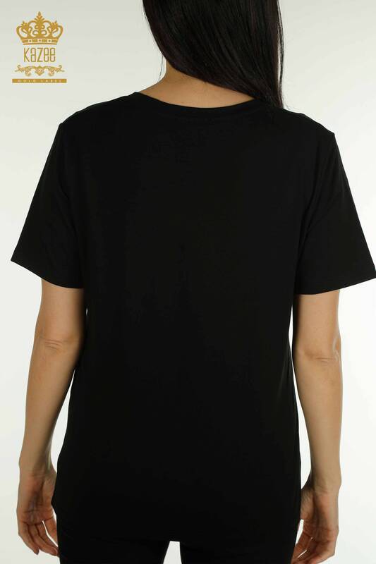 Großhandel Damenbluse mit Blumenstickerei, Steinstickerei, kurze Ärmel, Schwarz – 79860 | KAZEE
