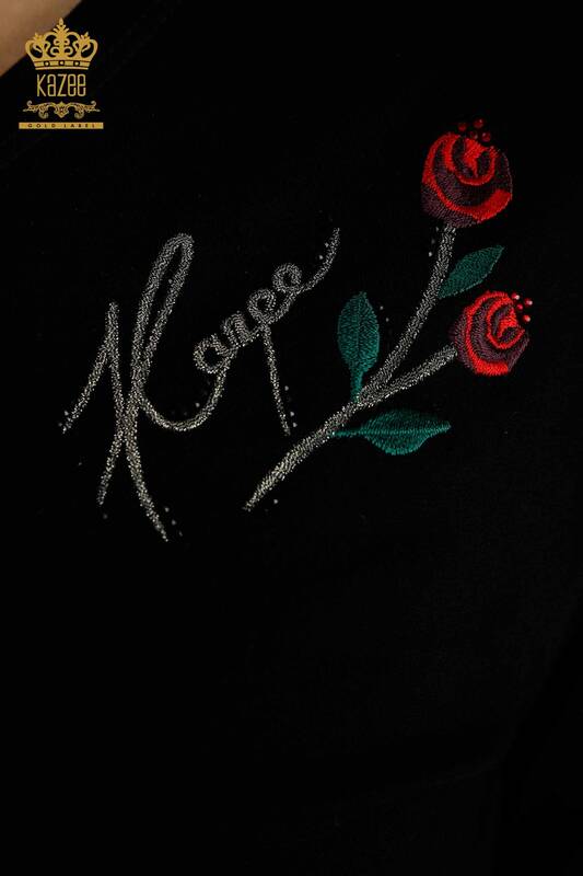 Großhandel Damenbluse mit Rosenstickerei, kurzen Ärmeln, Steinstickerei in Schwarz - 79867 | KAZEE