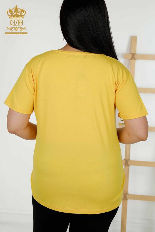 Großhandel Damenbluse mit gemustertem Stein, bestickt, kurze Ärmel, Gelb – 79329 | KAZEE