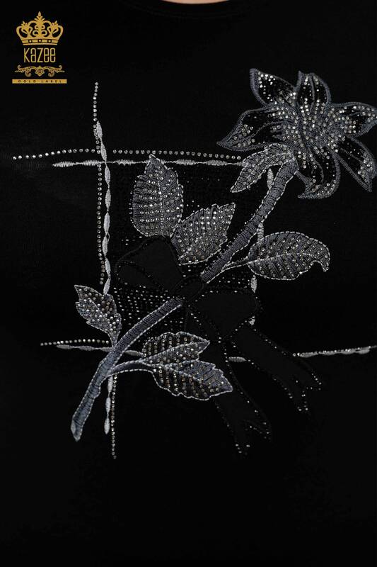 Großhandel Damenbluse Blumenmuster Stein bestickt Schwarz - 79011 | KAZEE