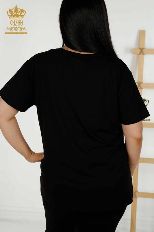Großhandel Damenbluse mit gemustertem Stein, bestickt, kurze Ärmel, Schwarz – 79329 | KAZEE