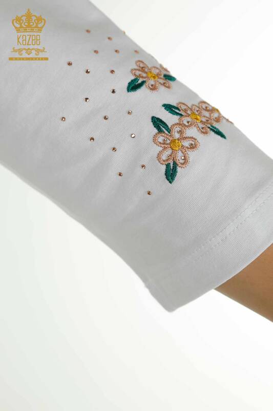 Großhandel Damenbluse, Tasche, detailliertes Blumenmuster, Stein bestickt, Weiß – 79477 | KAZEE