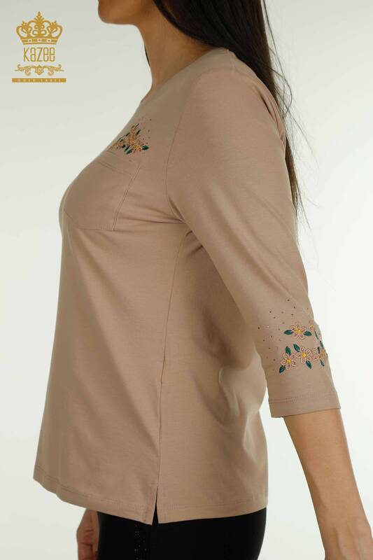 Großhandel Damenbluse mit Tasche, detailliertes Blumenmuster, Steinstickerei, Puder – 79477 | KAZEE