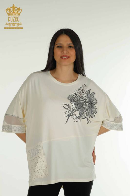 Großhandel Damenbluse Blume gemustert Stein bestickt Tüll detailliert Ecru - 79298 | KAZEE