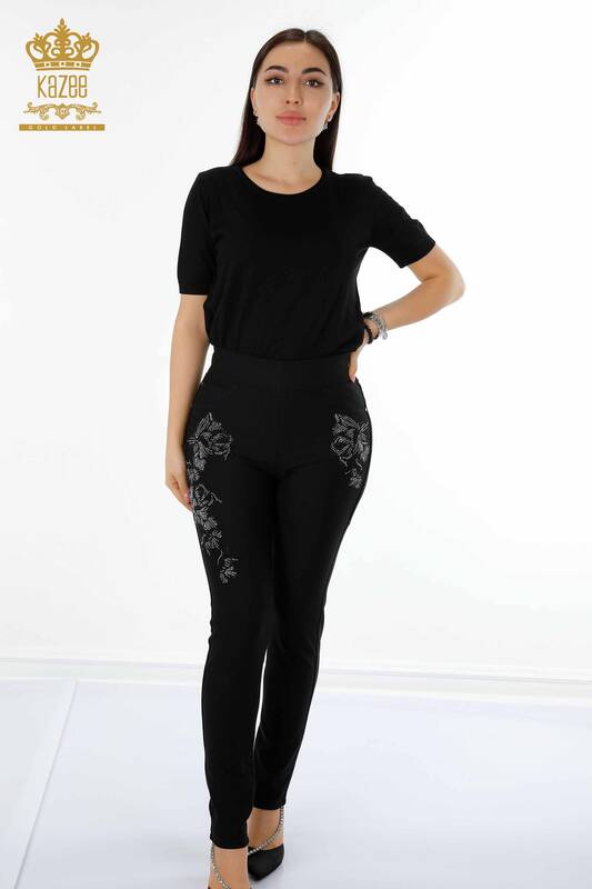 Großhandelsfrauen-Jeans gemustertes Schwarzes mit Kristallstein-gestickter Tasche - 3565 | KAZEE