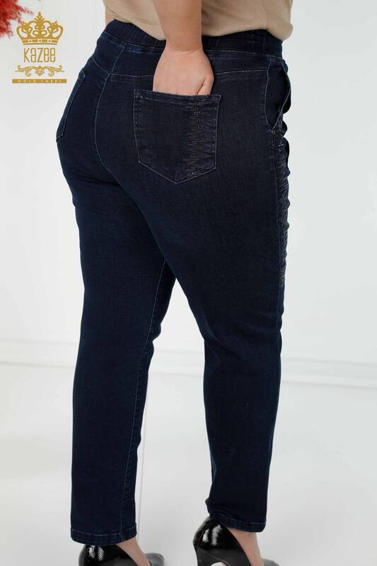 Großhandelsfrauen-Hose-elastische Taillen-Streifen-Stein bestickte Tasche ausführliches Marineblau - 3654 | KAZEE