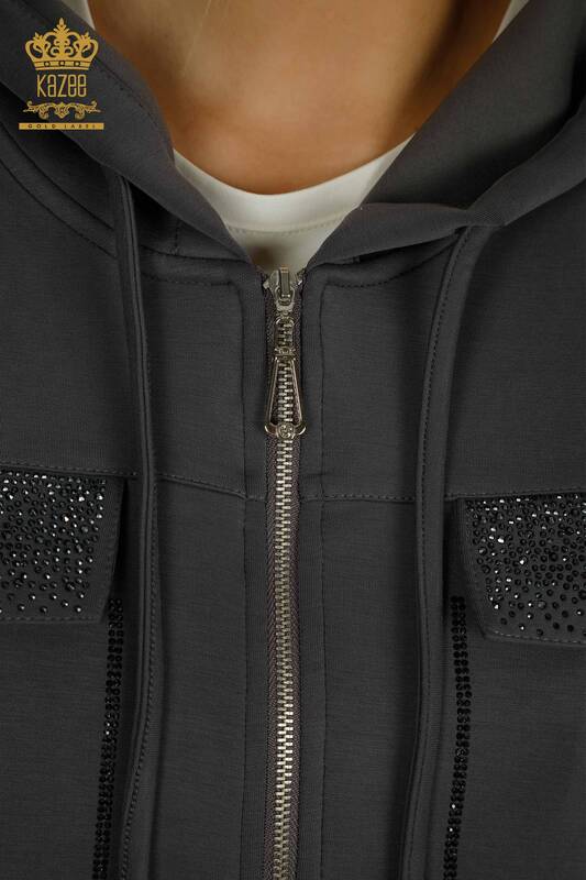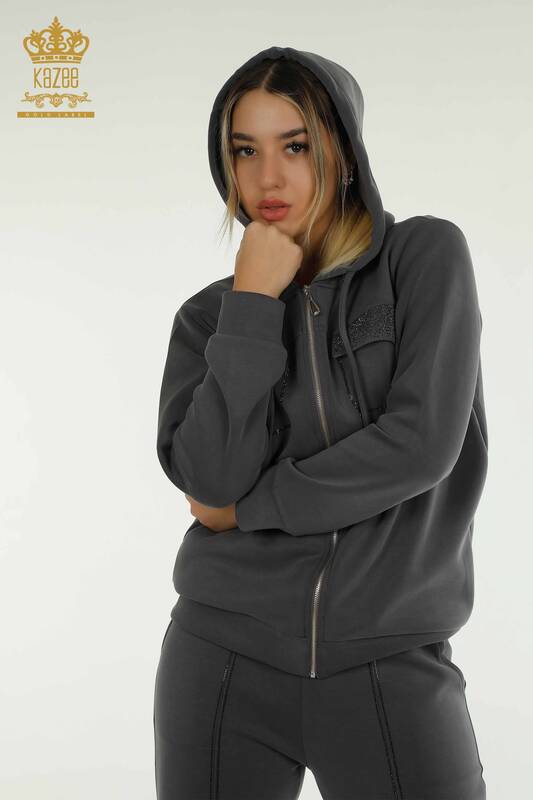 Großhandel Damen-Trainingsanzug-Set mit Kapuze, Reißverschluss, Steinstickerei, Grau – 17618 | KAZEE