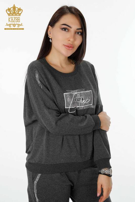 Trainingsanzug-Set für Großhandelsfrauen Kristallstein Bestickter Buchstabe Detaillierte Tasche Anthrazit - 17461 | KAZEE