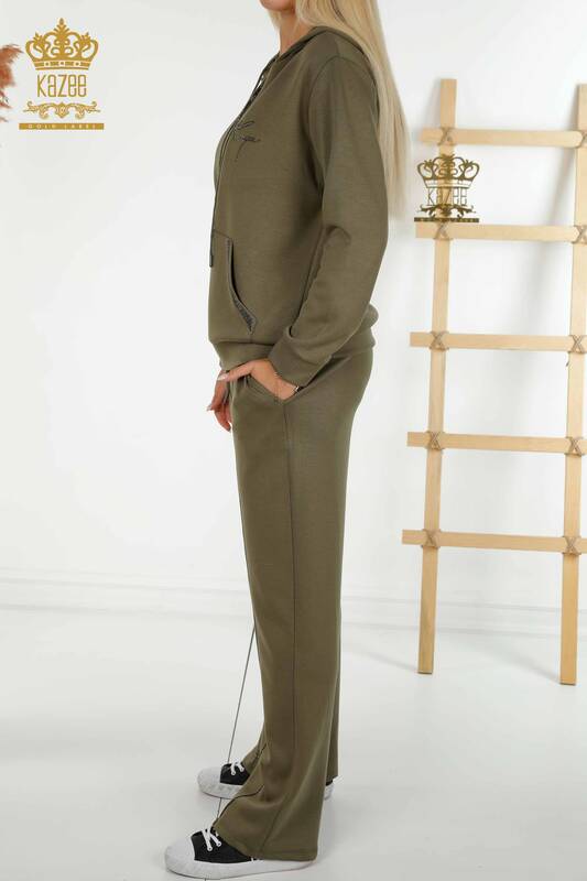 Großhandel Damen-Trainingsanzug-Set mit Stein bestickter Tasche und Kapuze, Khaki – 17598 | KAZEE