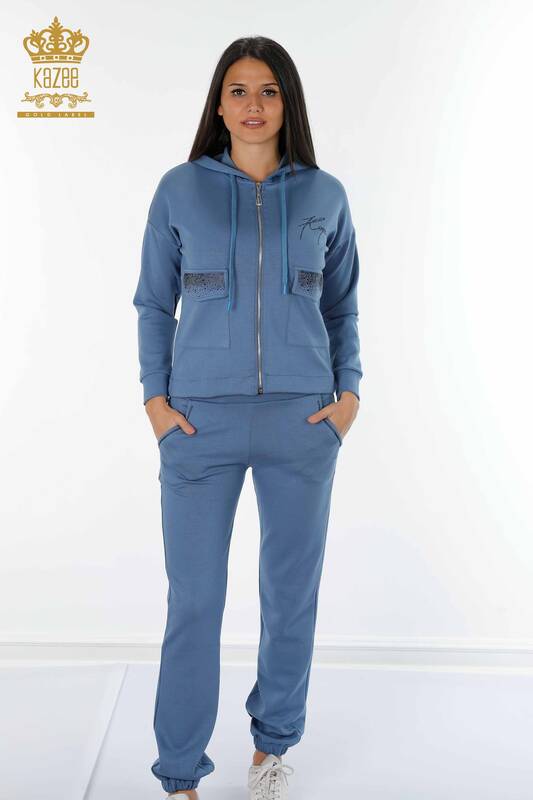 Großhandel Frauen Trainingsanzug Set Kapuzentasche Stein bestickt Indigo - 17426 | KAZEE