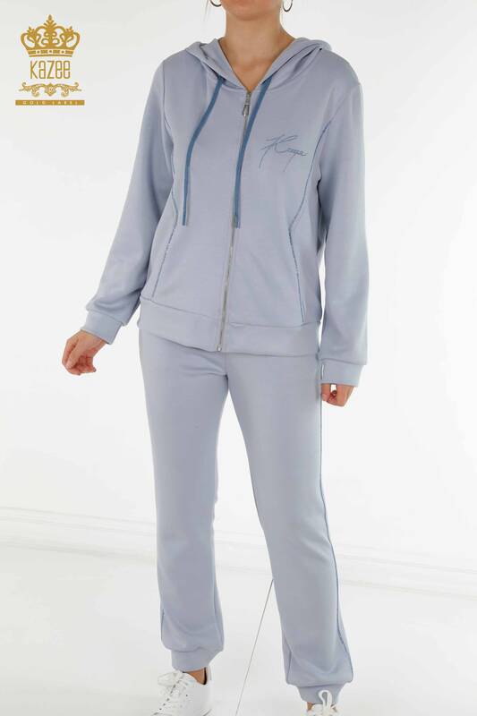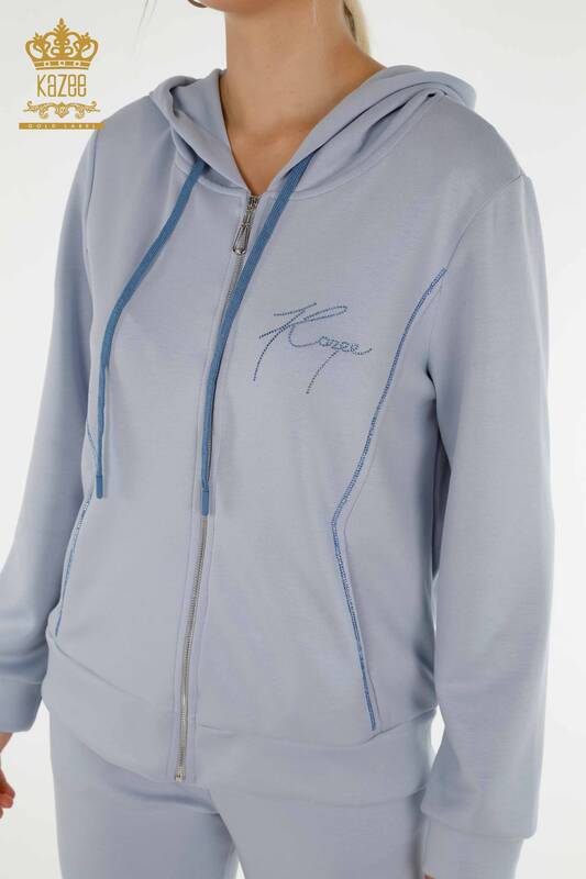 Großhandel Damen-Trainingsanzug-Set mit Stein besticktem Kapuzenreißverschluss Blau - 20414 | KAZEE