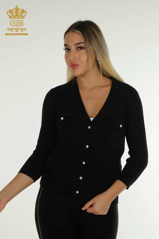 Großhandel Damen-Cardigan mit Knöpfen, detailliertem Glitzer-Übergang, Schwarz – 30366 | KAZEE