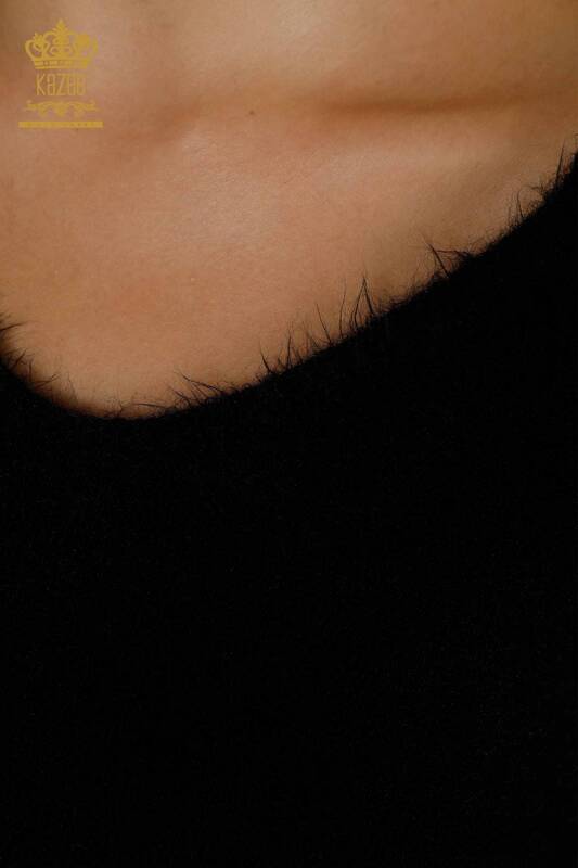 Großhandel Damen Strickpullover Angora V-Ausschnitt Basic Schwarz - 12047 | KAZEE