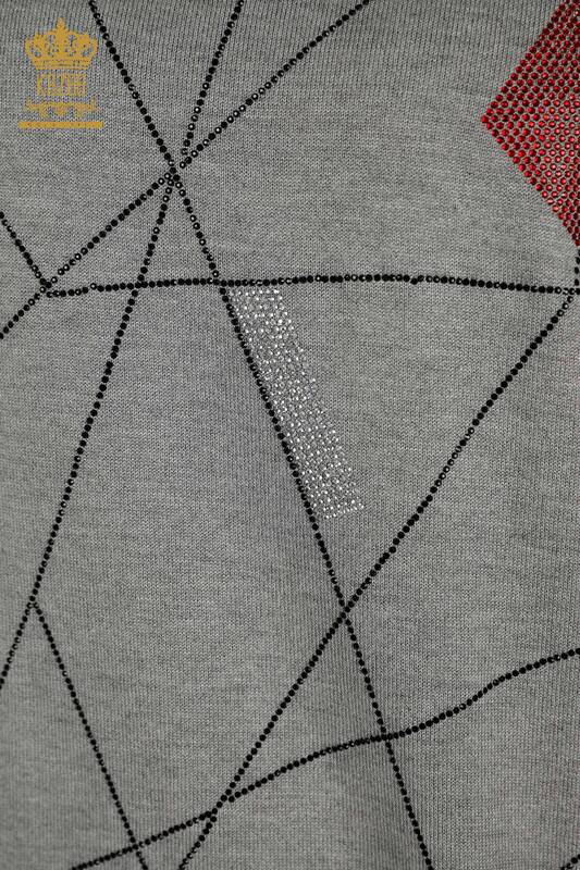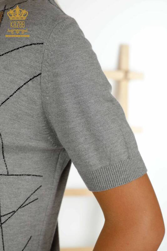 Großhandel Damen-Strickpullover mit Steinstickerei, Stehkragen, kurze Ärmel, Grau – 30078 | KAZEE