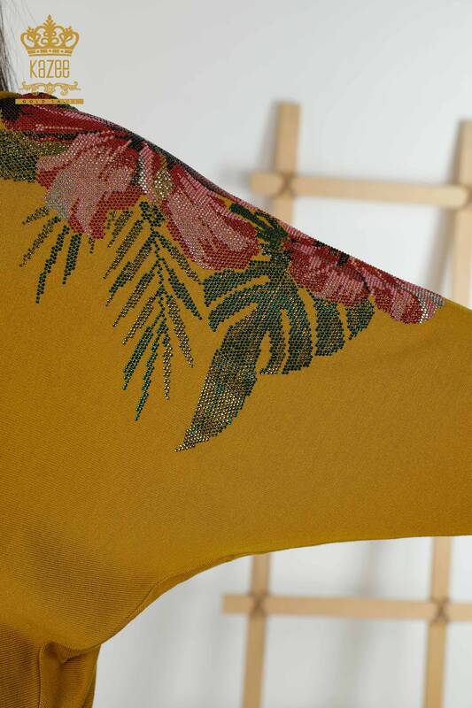 Großhandel Damen-Strickpullover mit Stone-Stickerei an der Schulter und Blumendetail Limette – 16133 | KAZEE