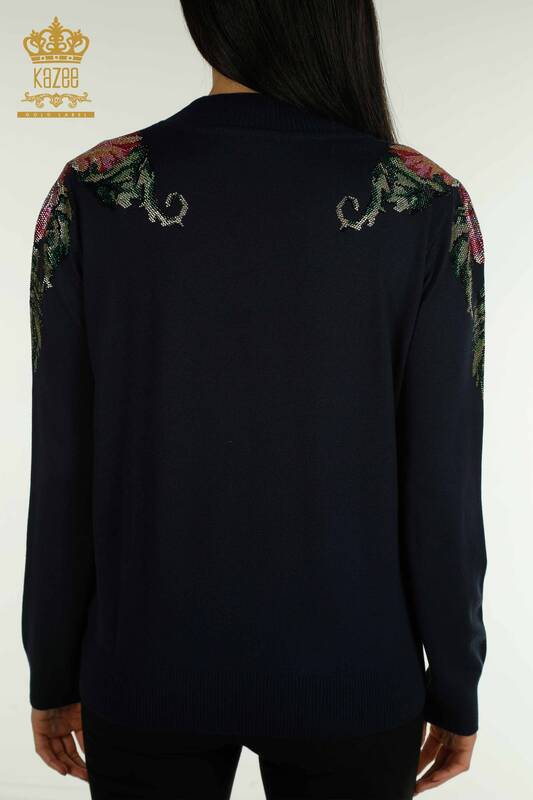 Großhandel Damen-Strickpullover, Schulter-Blumen-Detail, farbiger Stein, bestickt, Marineblau – 30542 | KAZEE