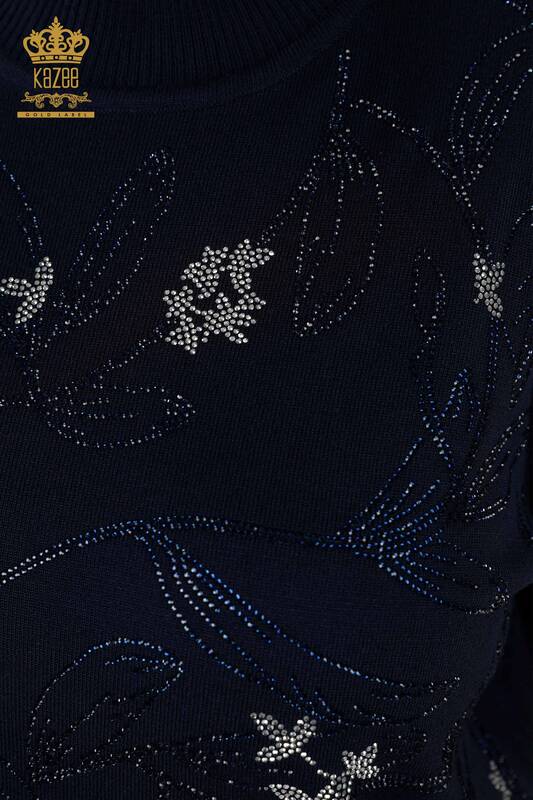 Großhandel Damen Strickpullover Blattmuster Kristallstein bestickt Marineblau - 30240 | KAZEE