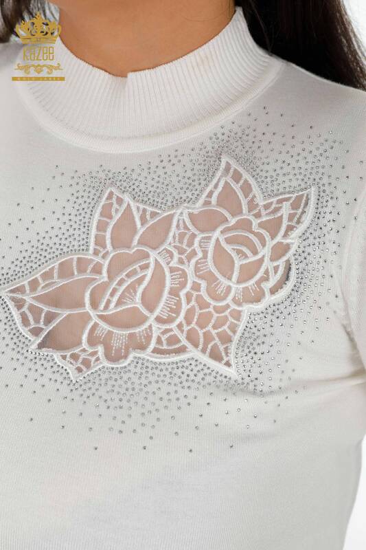 Großhandel Damen Strickwaren Pullover Tüll Detaillierte Stein Gestickte Rose Gemustert Ecru - 16832 | KAZEE