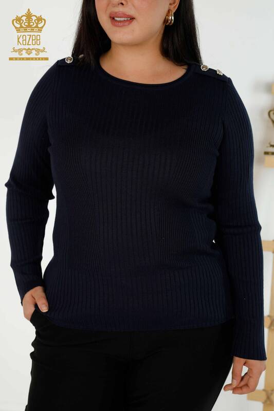 Großhandel Damen-Strickpullover mit Knopf und Rundhalsausschnitt, Marineblau – 30045 | KAZEE