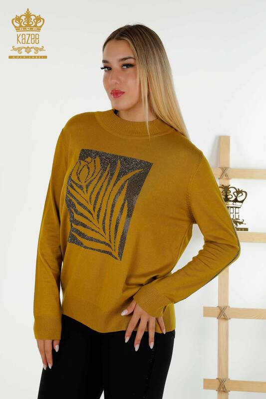 Großhandel Damen-Strickpullover mit Rosenmuster und Steinstickerei in Safran – 30448 | KAZEE