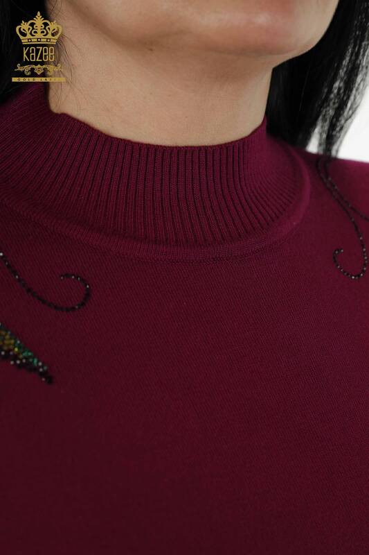 Großhandelsfrauenstrickwaren-Pullover-Schulter-Blumen-detaillierter Stein bestickt Lila - 30007 | KAZEE