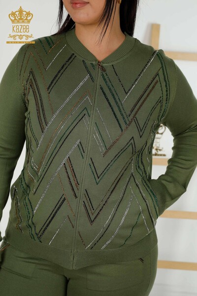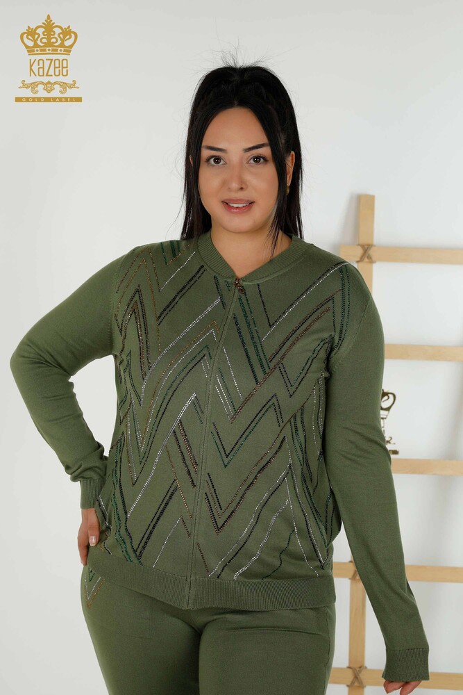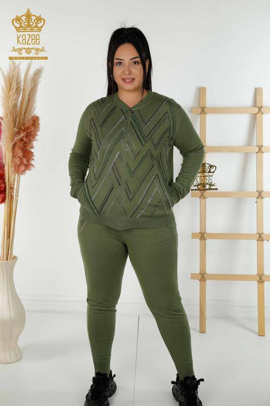 Großhandel Damen-Trainingsanzug-Set mit Stein bestickter Tasche und Reißverschluss Khaki - 16676 | KAZEE