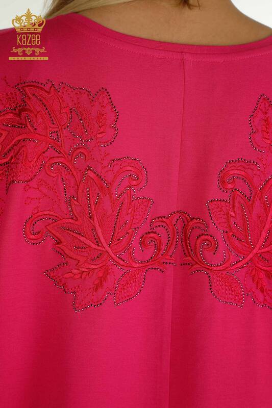 Großhandel Damenbluse mit Blattmuster, Steinstickerei, Fuchsia - 79090 | KAZEE