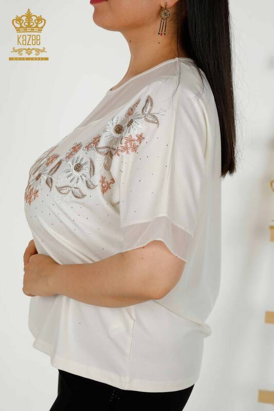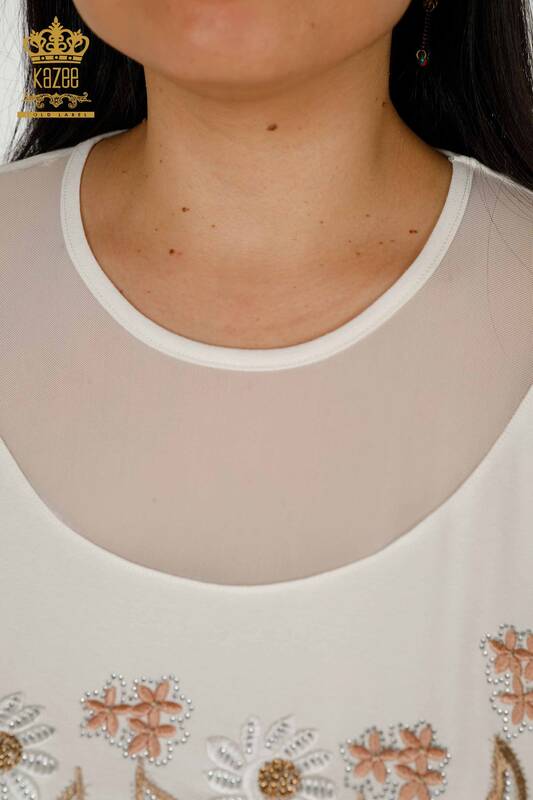 Großhandel Damenbluse mit Blumenmuster, Tüll, detaillierte Steinstickerei, Ecru – 79137 | KAZEE