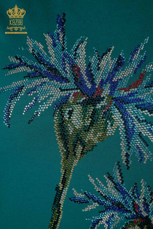 Großhandel Damenbluse Blumenmuster Steinbestickt Kurzarm Grün - 79369 | KAZEE
