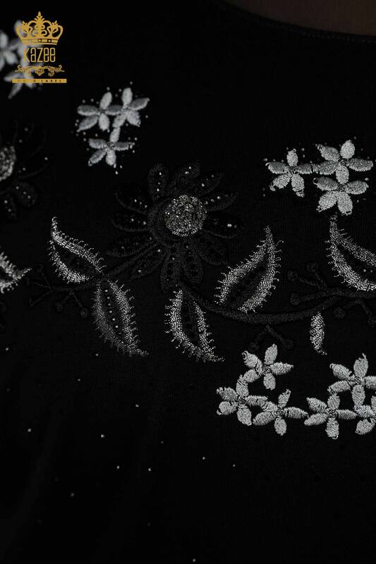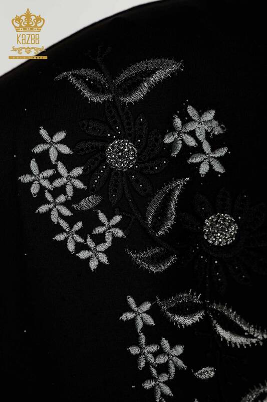 Großhandel Damenbluse mit Blumenmuster, Tüll, detaillierte Steinstickerei, Schwarz – 79137 | KAZEE