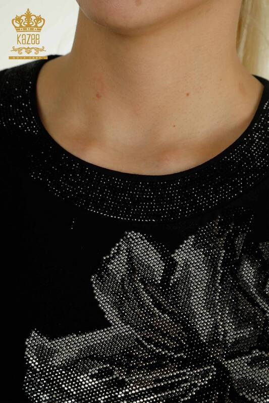 Großhandel Damenbluse mit Blumenmuster und Steinstickerei in Schwarz - 79382 | KAZEE