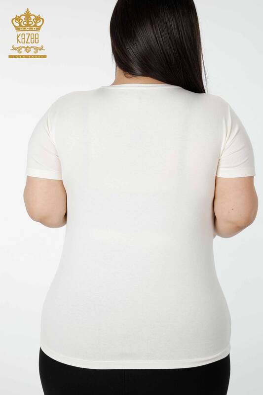 Großhandel Damenbluse Blumenmuster Farbiger Stein Bestickt Ecru - 78924 | KAZEE