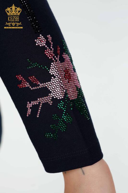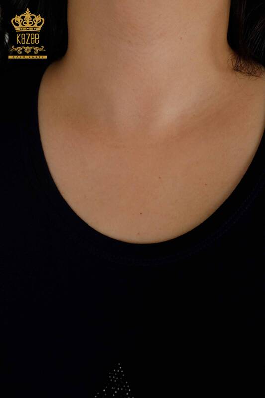 Großhandel Damenbluse Gemustert Farbiger Stein Bestickt Marineblau - 77942 | KAZEE