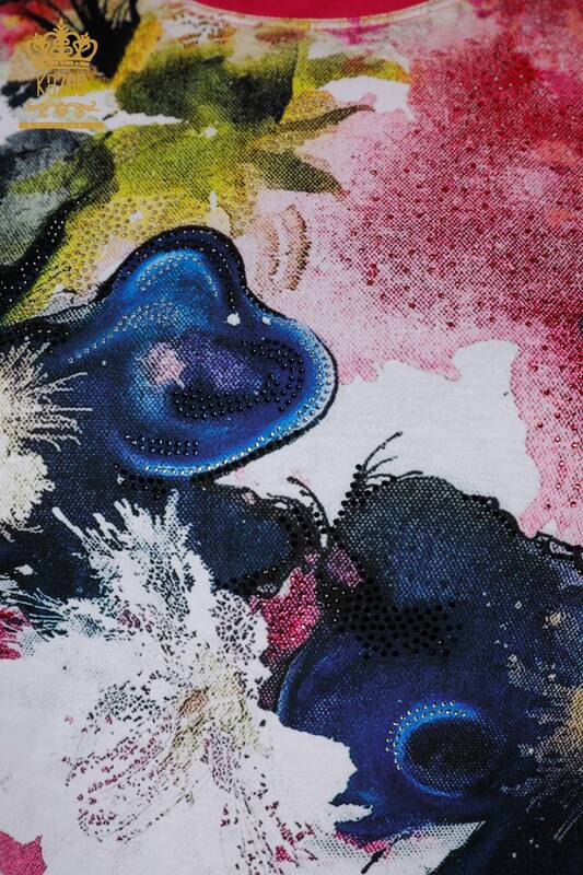 Großhandel Damenbluse Kurzarm Steinbestickter Digitaldruck - 12008 | KAZEE