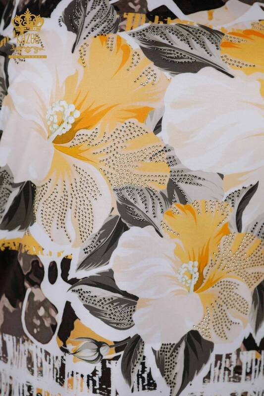 Großhandel Damenbluse mit Digitaldruck, Steinstickerei, kurze Ärmel – 12202 | KAZEE