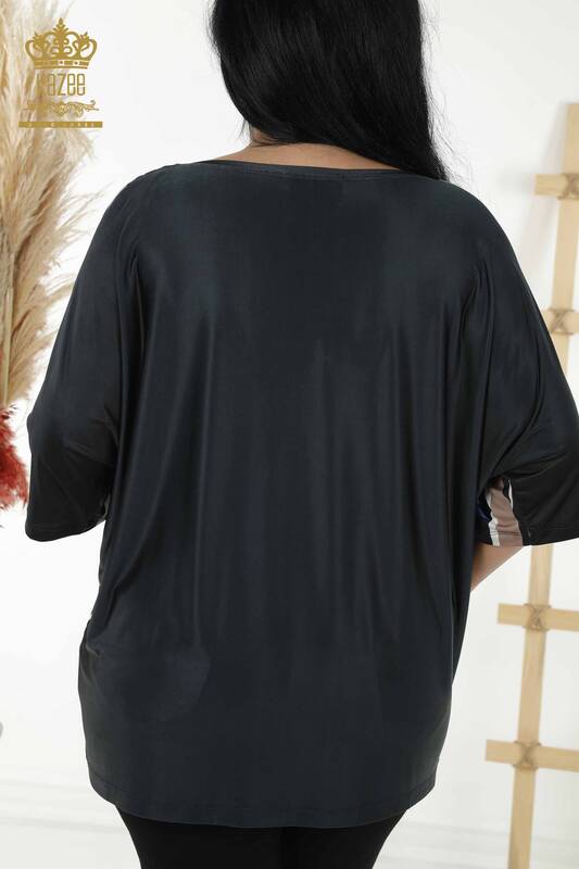 Großhandel Damenbluse Digitaldruck Stein bestickt Kurzarm Navy - 12043 | KAZEE