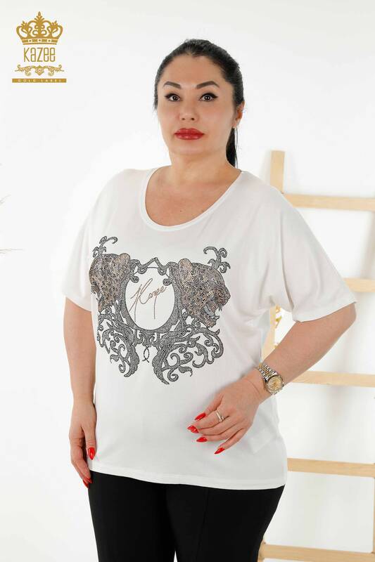 Großhandel Damenbluse Leopardenmuster Stein bestickt Ecru - 77648 | KAZEE