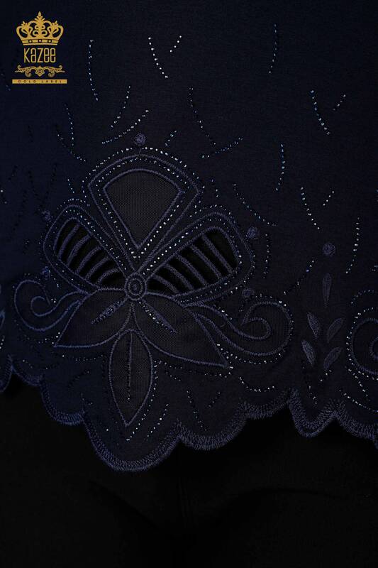 Großhandel Damenbluse Stone Bestickter Tüll Detaillierter V-Ausschnitt Schwarz - 77927 | KAZEE