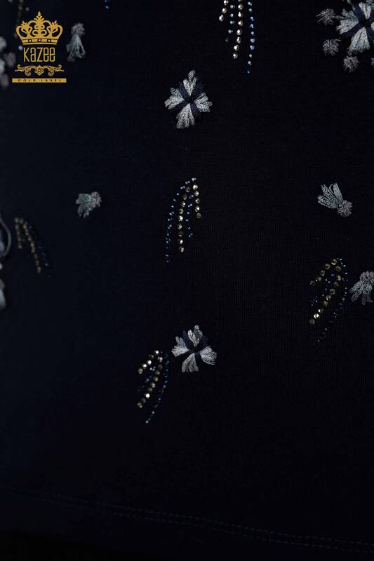 Großhandel Damenbluse Tüll Detailliertes Blumenmuster Steinbestickt Marineblau - 79133 | KAZEE