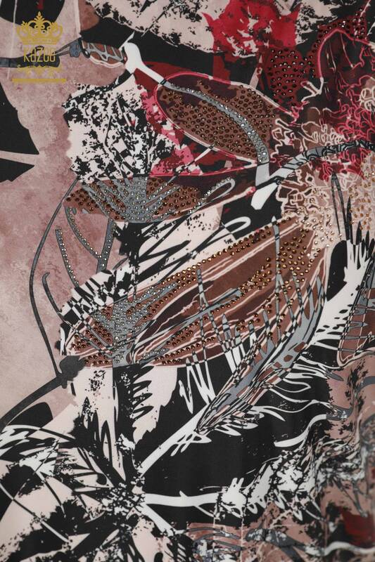 Großhandel Damenbluse Digitaldruck Stein bestickt Kurzarm Schwarz - 12060 | KAZEE