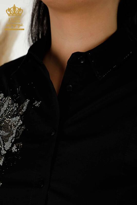 Großhandel Damenkleid mit Blumenmuster und Steinstickerei in Schwarz - 20271 | KAZEE