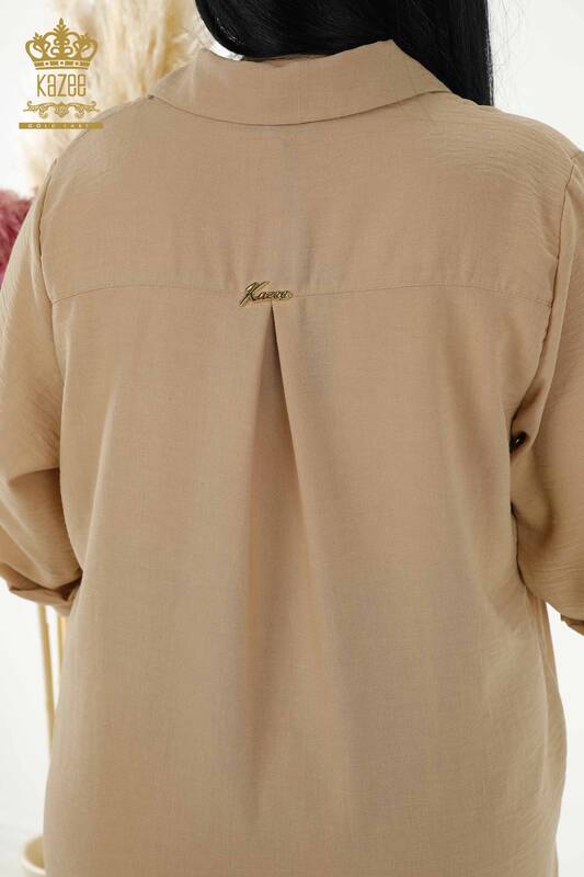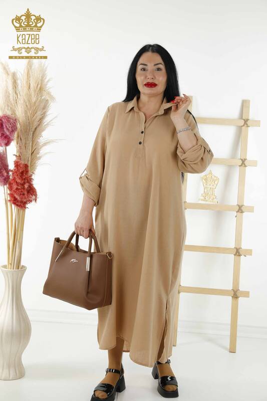 Großhandelsfrauen-Kleid-halbe Knopf-ausführliche Tasche Beige - 20385 | KAZEE