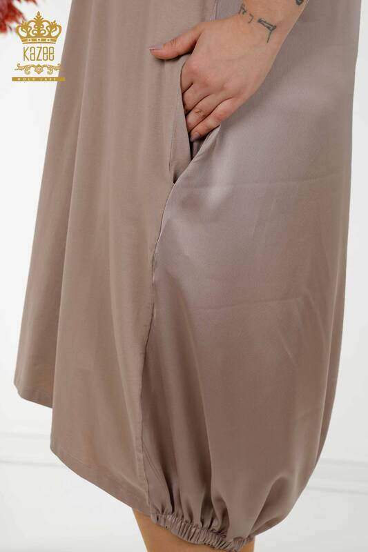 Großhandelsfrauenkleid mit Text ausführlicher Stein bestickter Tasche Beige - 20331 | KAZEE