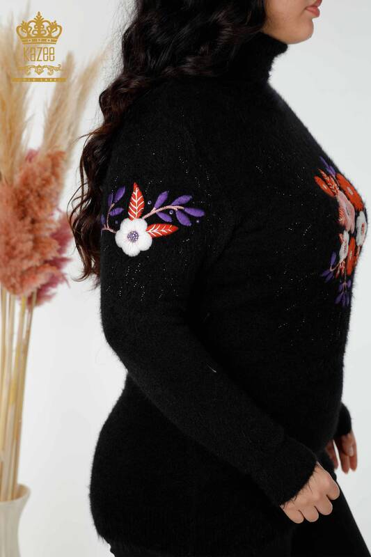 Großhandel Damen Strickjacke mit Stein bestickt Blumenmuster Angora Schwarz - 18919 / KAZEE