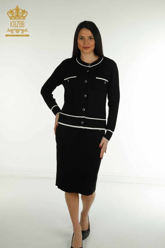 Zweiteiliger Damen-Anzug mit langen Ärmeln und Knöpfen, gestreift, Schwarz – 30867 | KAZEE
